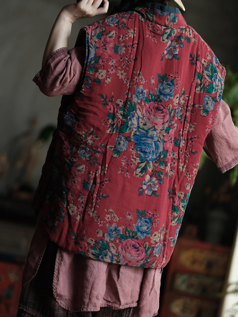 Women Ethnic Autumn Flower V-Neck Cotton Vest QU024