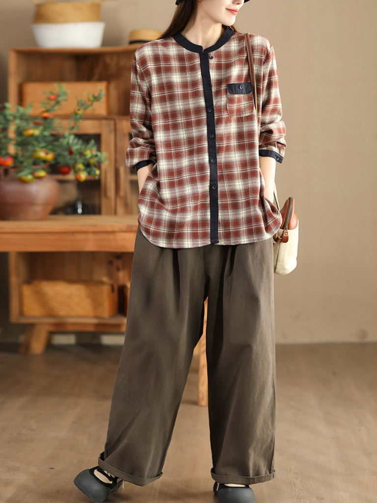 Women Ethnic Autumn Plaid Cotton Colorblock Shirt Coat AV1034