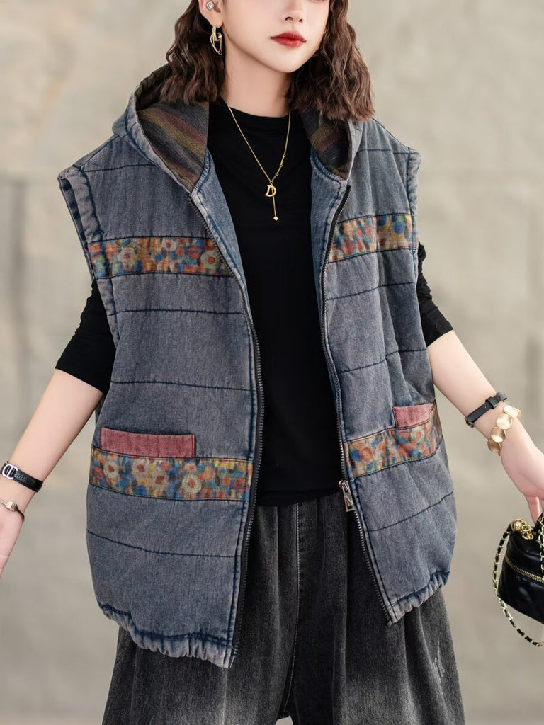 Women Retro Floral Spliced Hooded Cotton Padded Vest Coat WG007