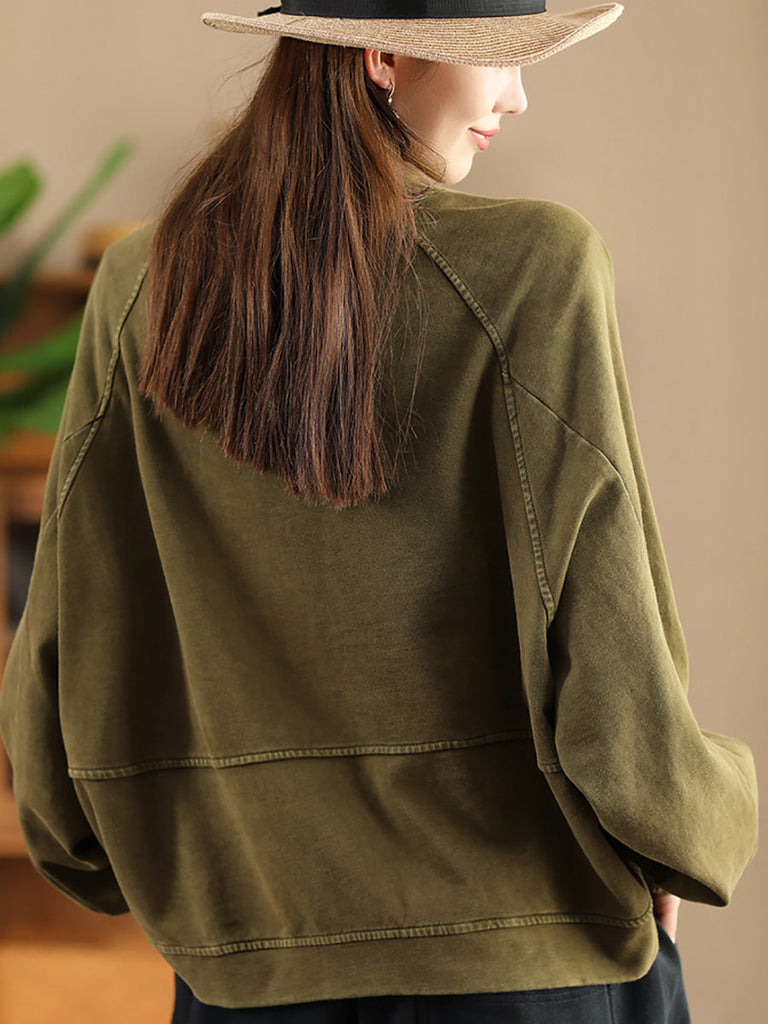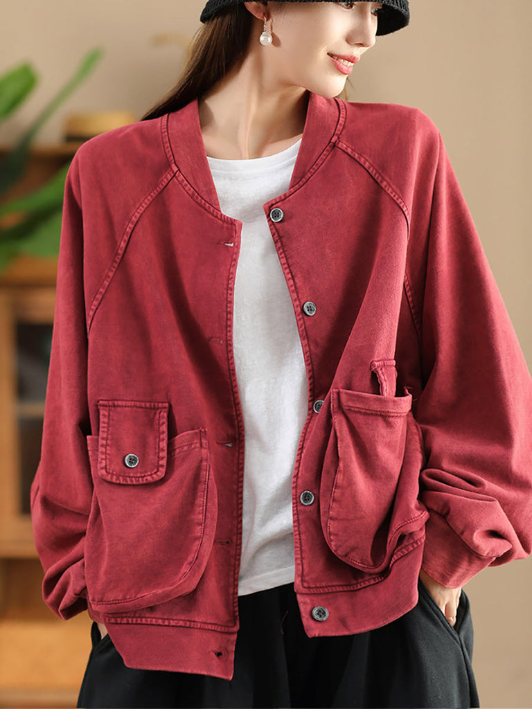 Women Retro Pure Color Stand Collar Pocket Cotton Coat AX1008