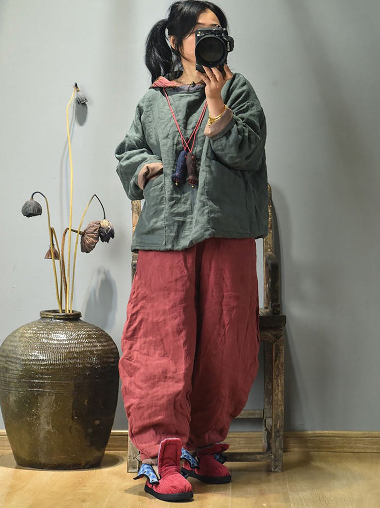 Women Winter Colorblock Hooded Linen Padded Coat AT1094