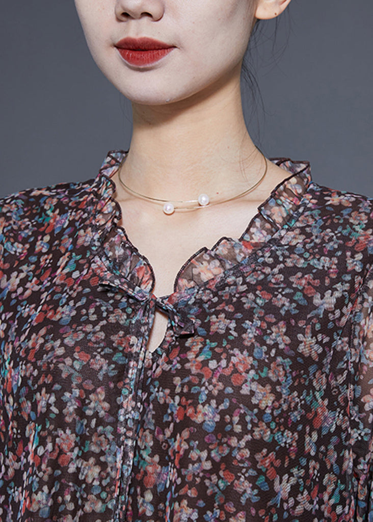 Bohemian Black Ruffled Print Lace Up Chiffon Mid Dress Summer