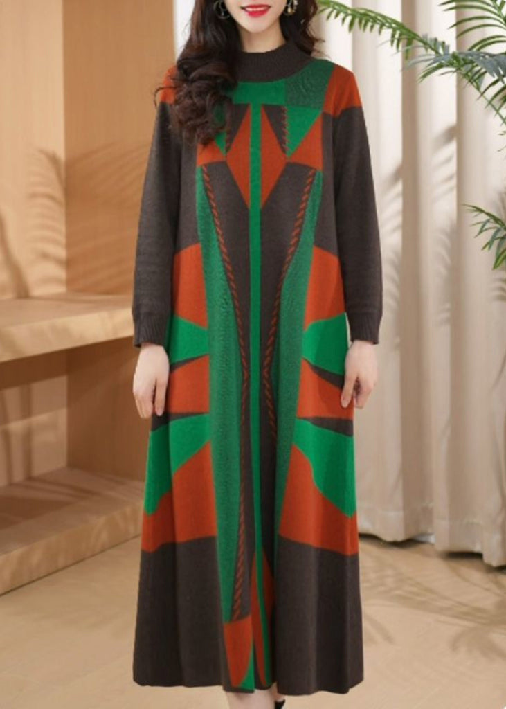 Chic Green O Neck Geometric Woolen Long Knit Dress Winter RF012