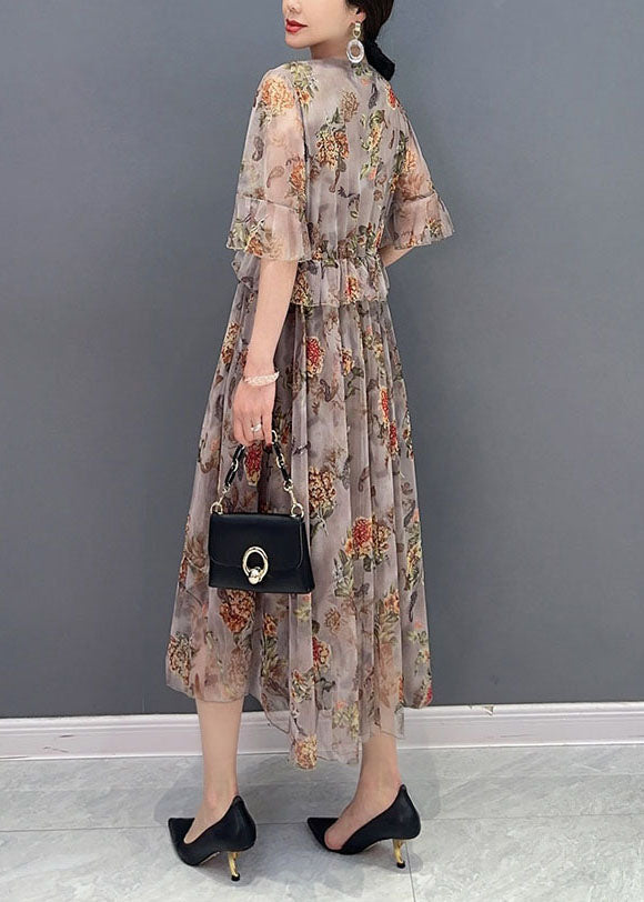 Classy Khaki V Neck Ruffles Print Chiffon Beach Dress Summer