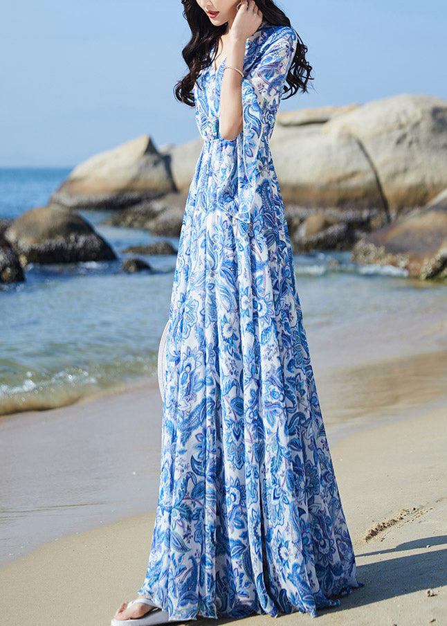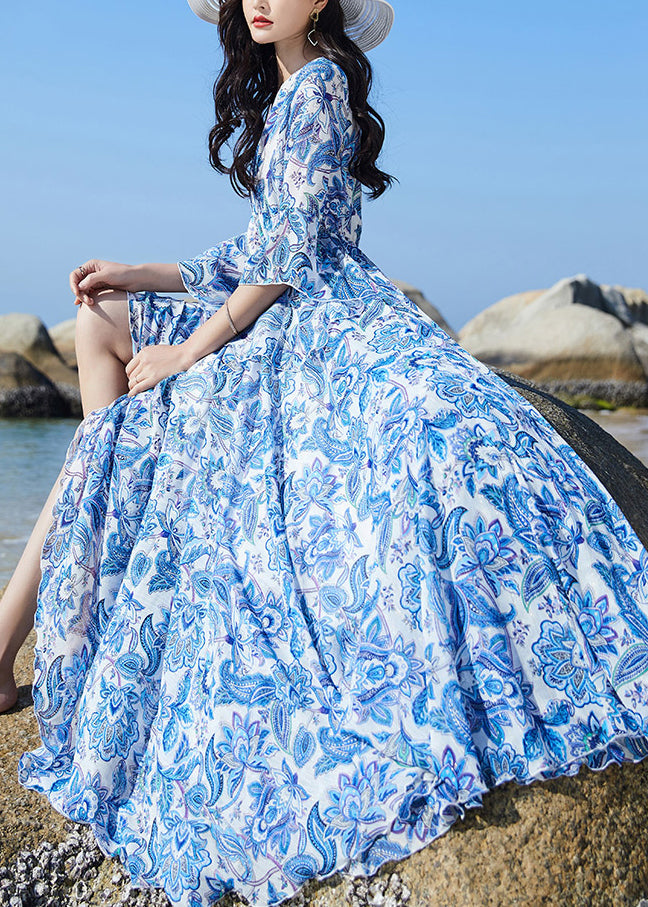 Elegant Blue V Neck Print Elastic Waist Chiffon Vacation Maxi Dresses Flare Sleeve