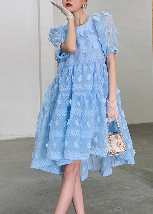 Elegant Light Blue O-Neck Floral Zippered Long Dresses Puff Sleeve
