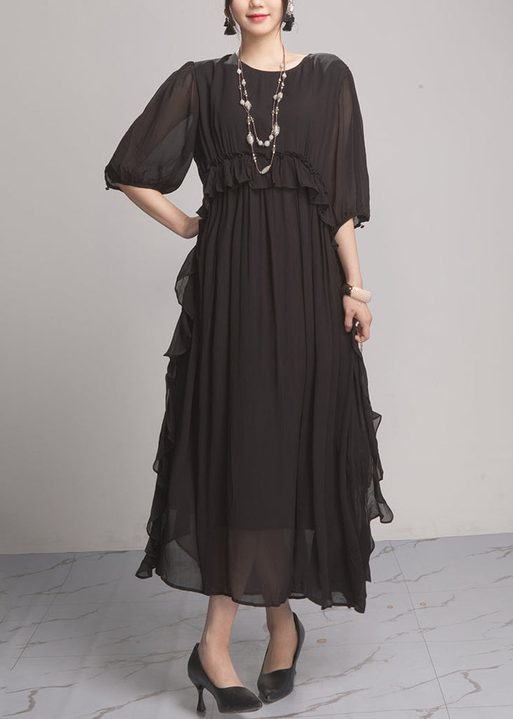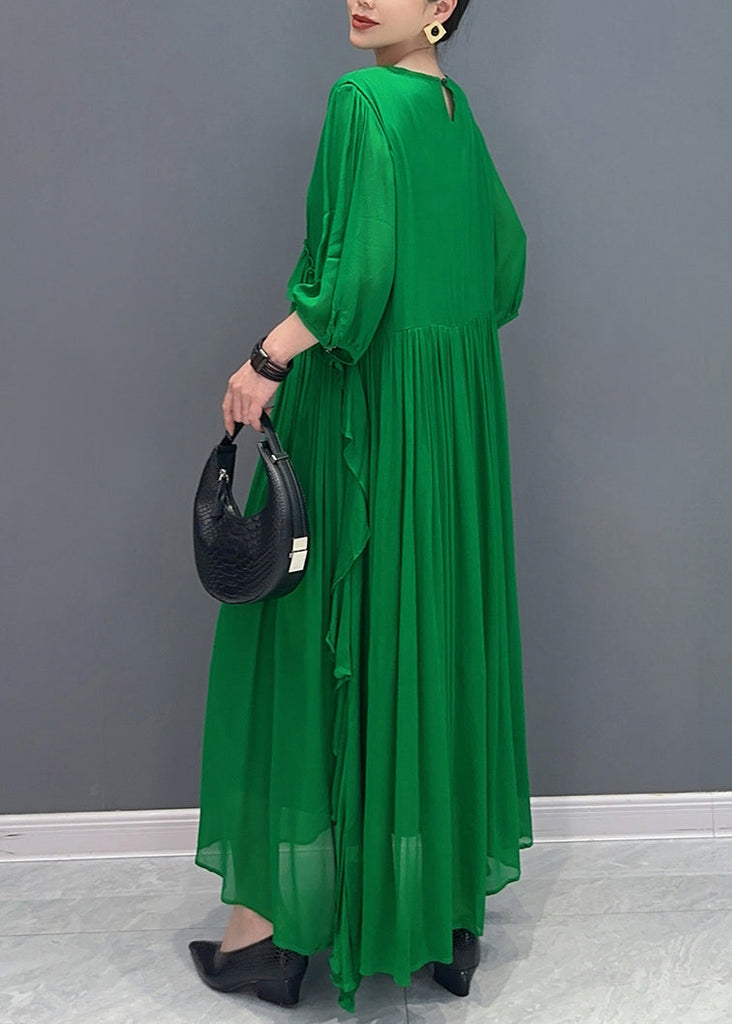 Handmade Green O-Neck Ruffled Wrinkled Vacation Chiffon Maxi Dresses Lantern Sleeve AO1027