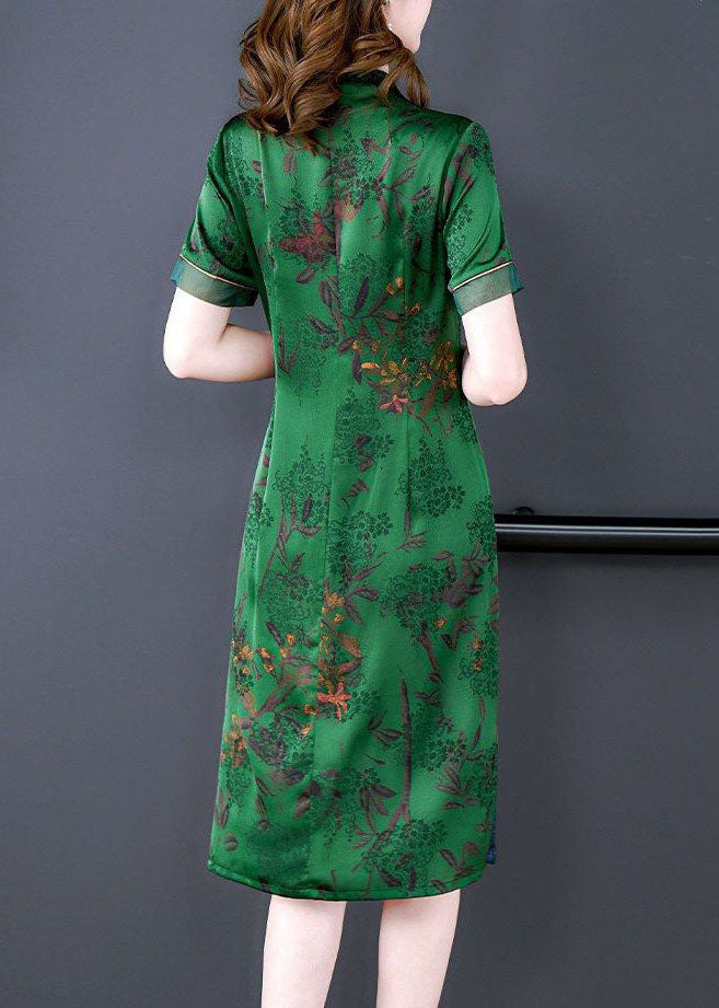 Handmade Green V Neck Print Slim Fit Silk Long Dress Summer