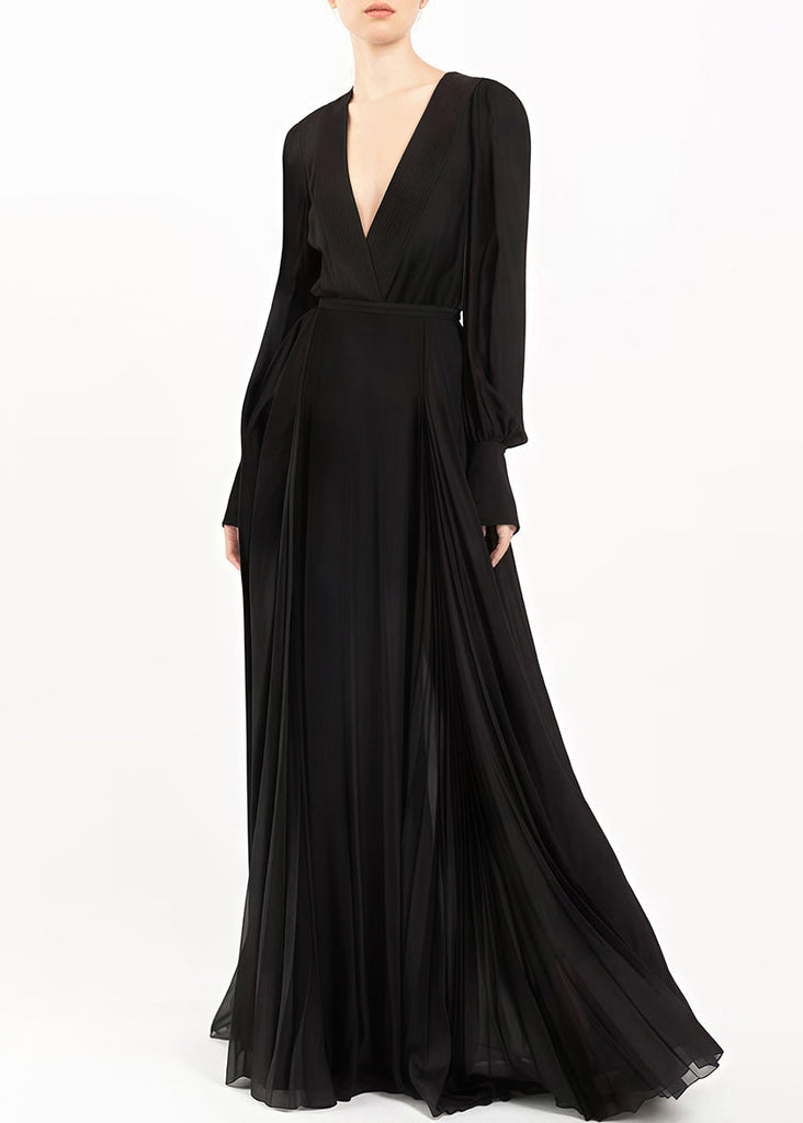 Italian Black V Neck Wrinkled Zippered Chiffon Maxi Dresses Fall AM1028