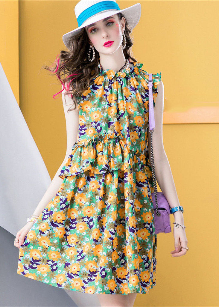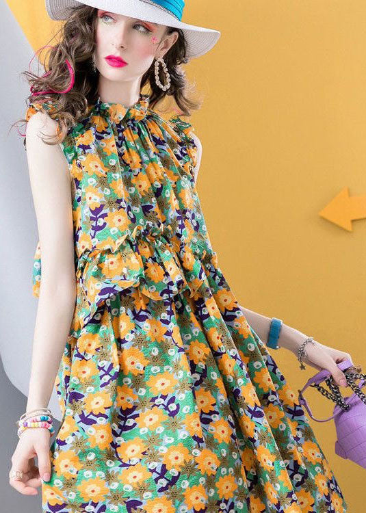 Modern Yellow Ruffled Print Patchwork Cotton Dress Sleeveless LC0218