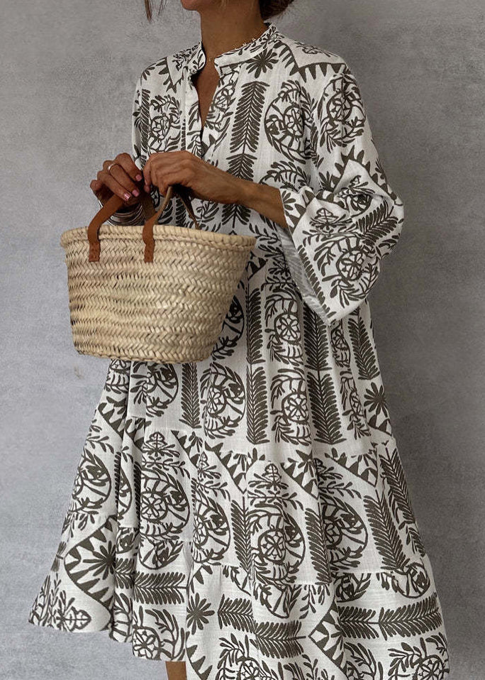 Organic Khaki V Neck Print Cotton Mid Dresses Fall QY040 BB-ZS-WM-FDM241002