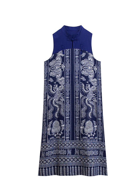 Retro Blue Chinese Button Patchwork Side Open Linen Long Dress Sleeveless