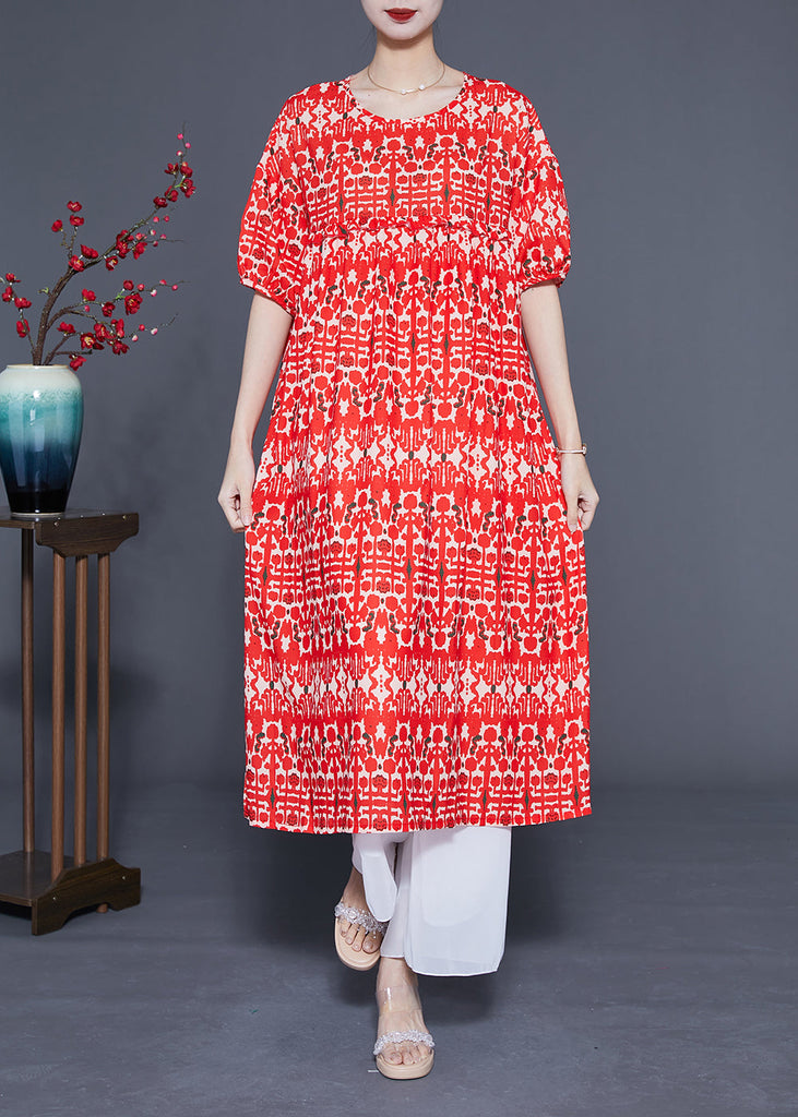 Simple Red O-Neck Ruffled Print Silk Holiday Dress Summer
