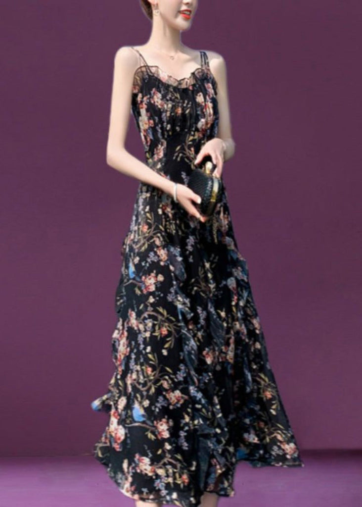 Slim Fit Black Slash Neck Ruffled Print Chiffon Long Slip Dress Summer LC0049