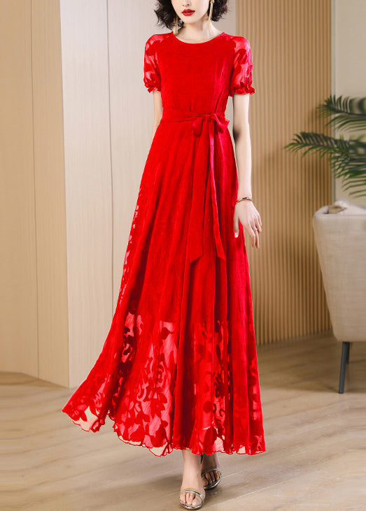 Unique Red O Neck Print Lace Up Chiffon Dress Summer