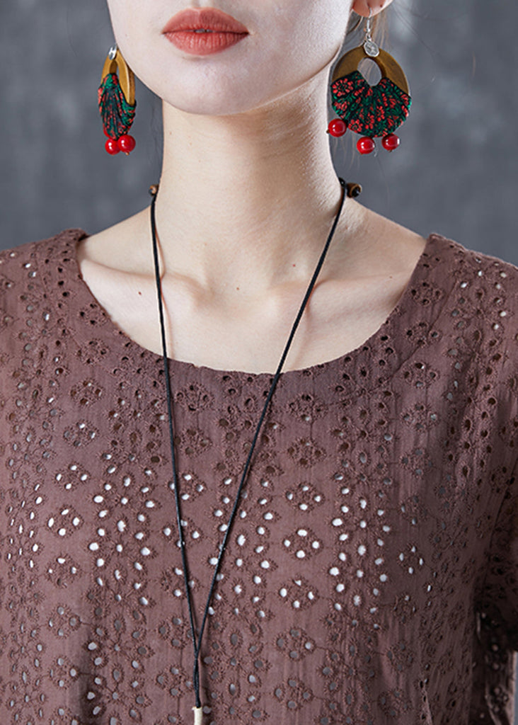 Unique Coffee Hollow Out Patchwork Plaid Cotton Dresses Summer