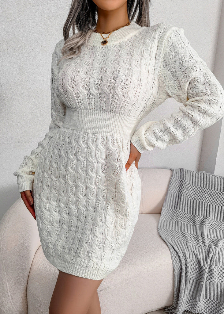 Indulge yourself in the luxurious and exclusive Women White O Neck Slim Fit Knit Sweater Dress, perfect for fall's cooler temperatures. Elevate your style with this elegant piece that will enhance your wardrobe and make you stand out in any crowd.