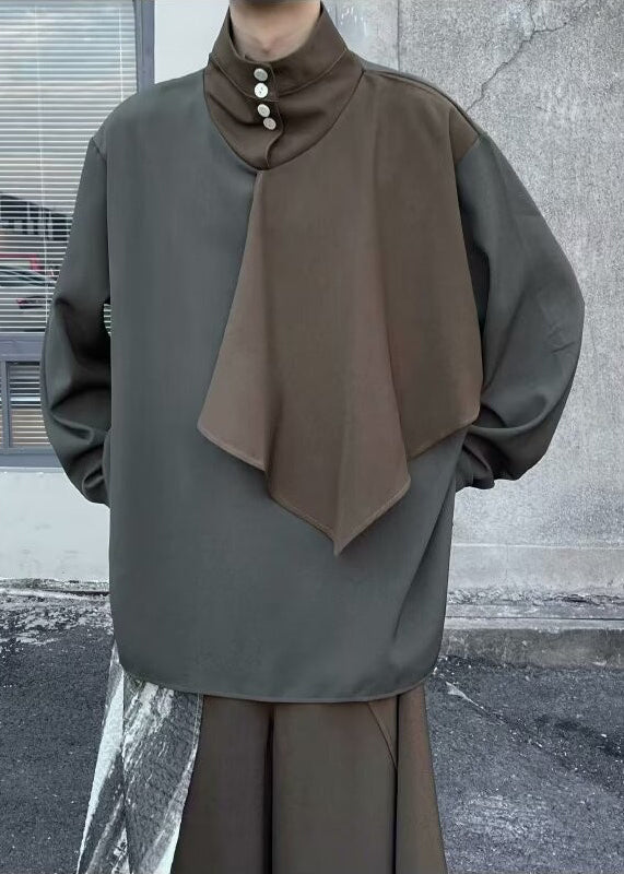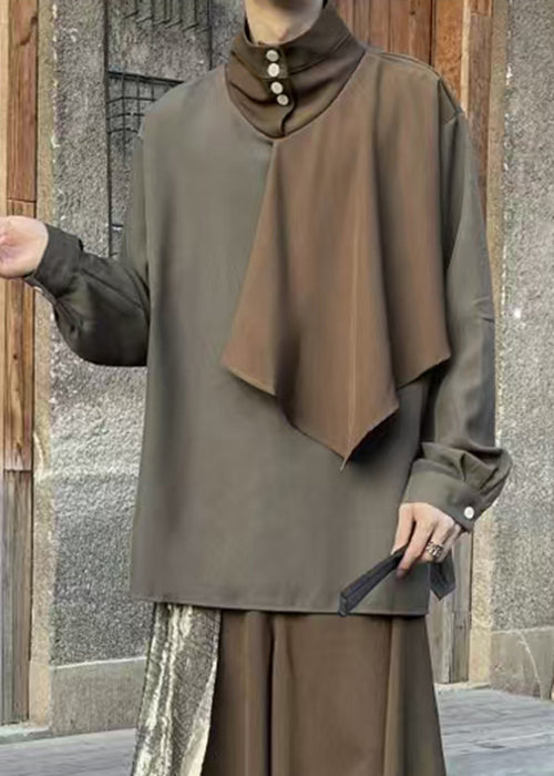 New Brown Stand Collar Patchwork Cotton Men T Shirt Fall WJ029