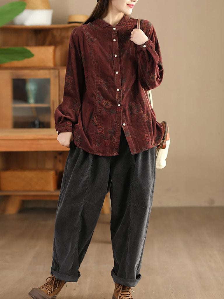 Women Retro Autumn Flower Turn-down Collar Corduroy Shirt BA1019