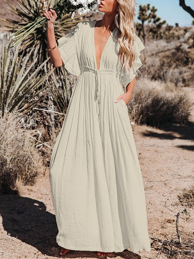 Dresses Type: Faux Cotton Linen, Casual Dress, Swing Dress, Fabric: Polyester, Linen texture style, Gender: Women's, Occasion: Beach, Style: Boho, Fit Type: Loose Fit, Dress Length Type: Long Dress Maxi Dress, Neckline: V Neck, Sleeve Length: Short Sleeve, Look After Me: Machine wash, Hand wash, Pattern: Pure Color, Season: Spring, Summer, Fall, Special selected products: COD,