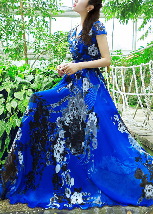 Beautiful Royalblue Print Tunic Chiffon Long Beach Dress Short Sleeve LY1722