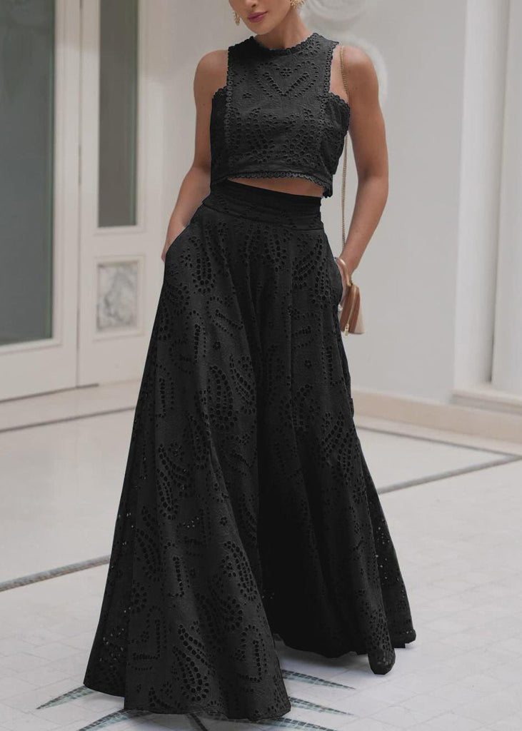 French Blue Hollow Out Tops And Skirts Cotton Two Piece Set Sleeveless