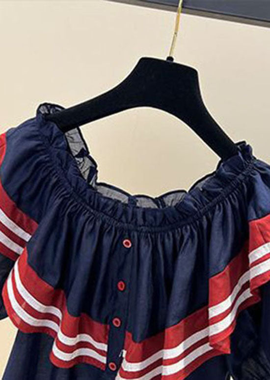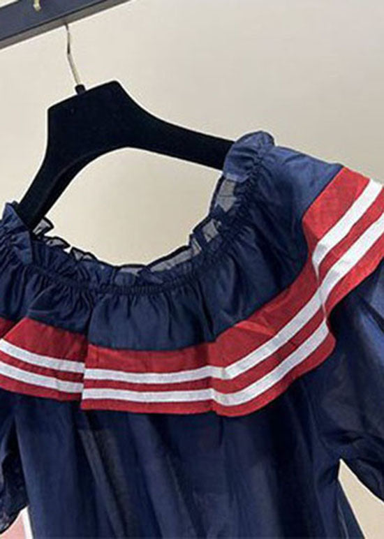 Art Navy Slash Neck Ruffled Patchwork Chiffon Tops Summer LY0588