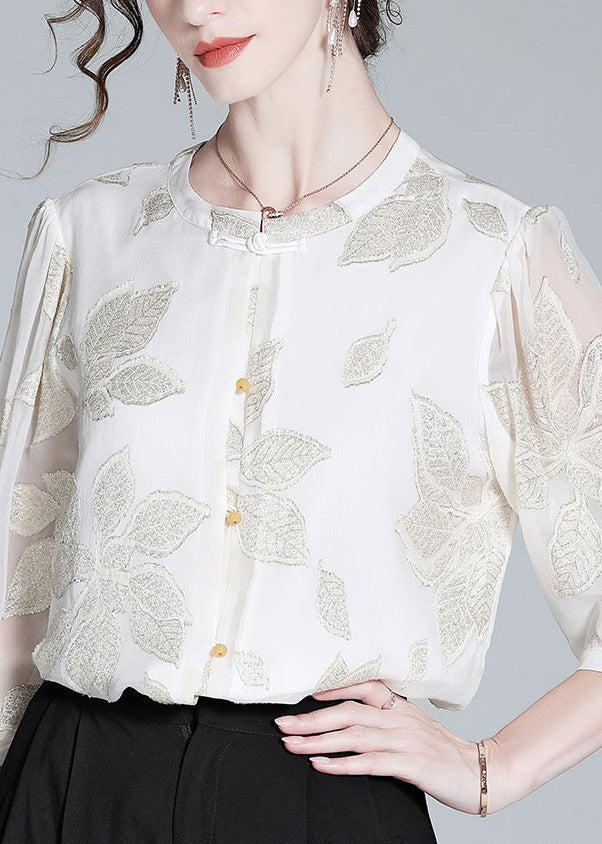 The Fine White O-Neck Embroideried Print Button Silk Top AC3033 destined to impress, and priced at only $56.70, for a limited time.
