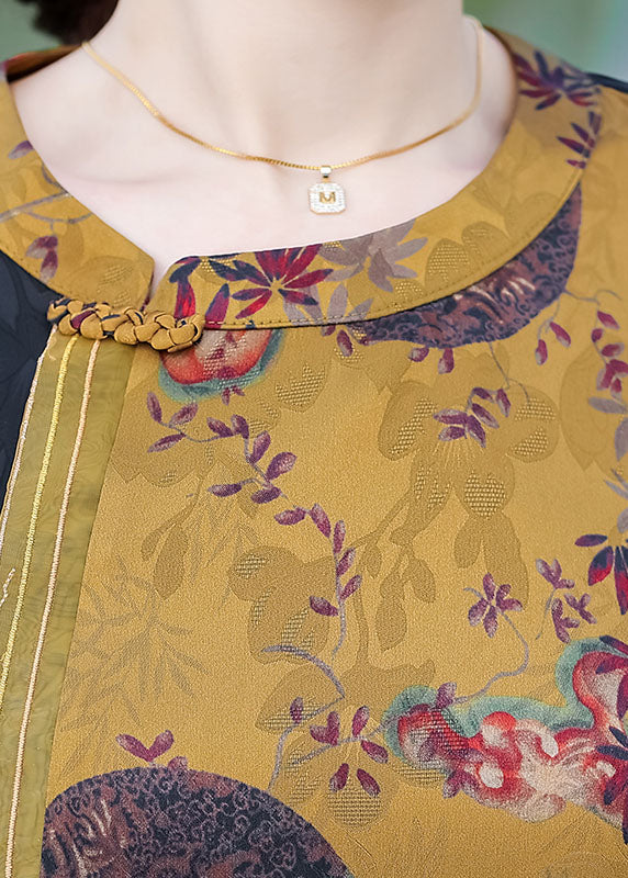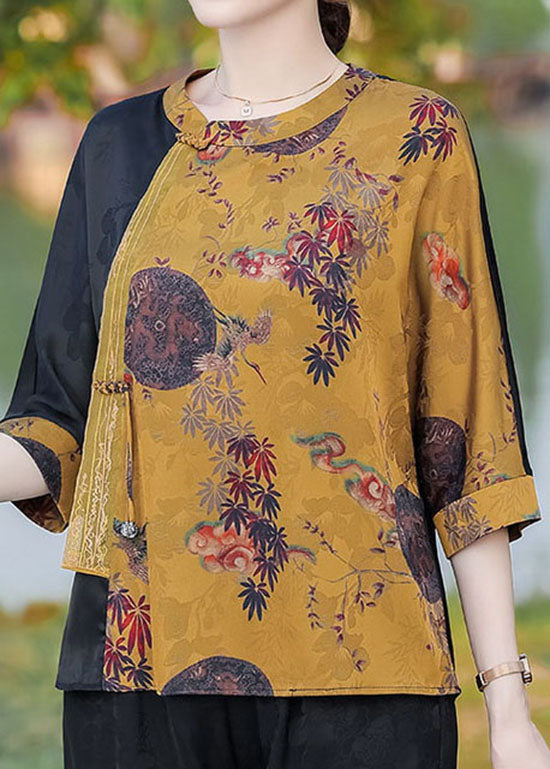 French Yellow O Neck Print Patchwork Silk Top Summer