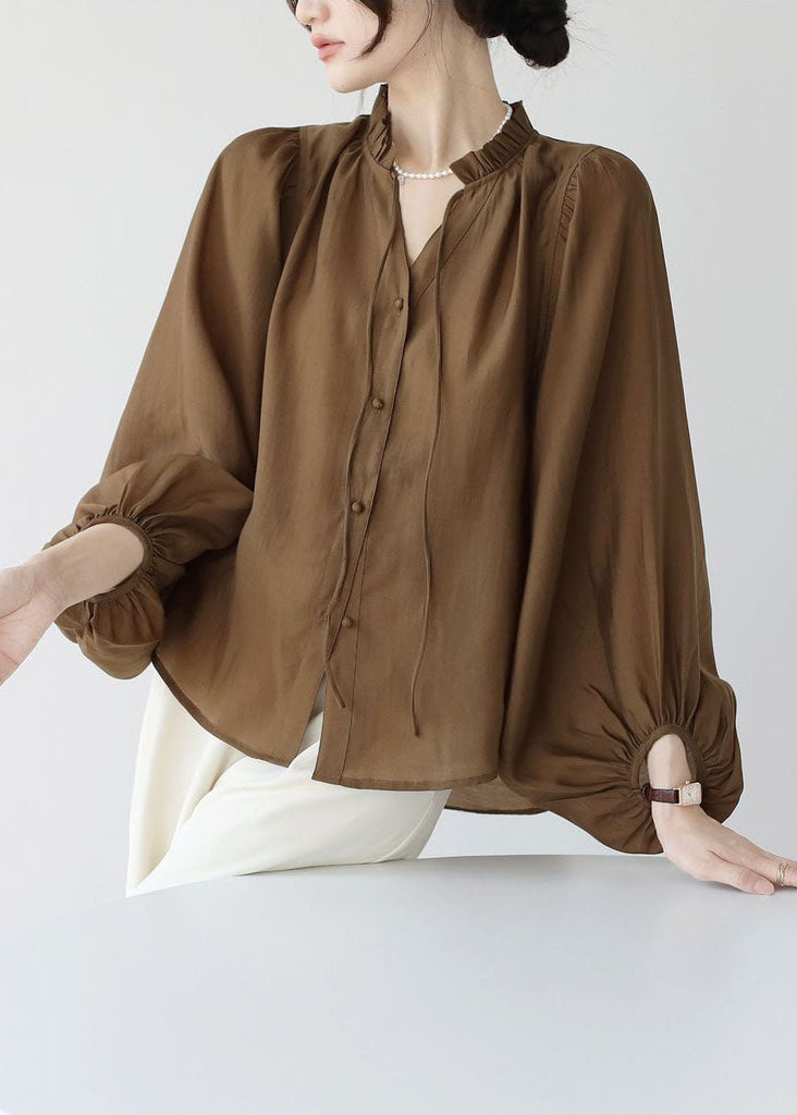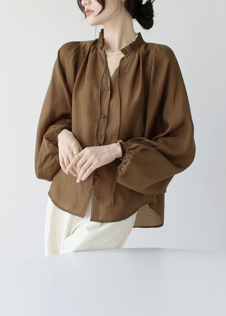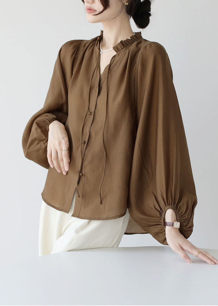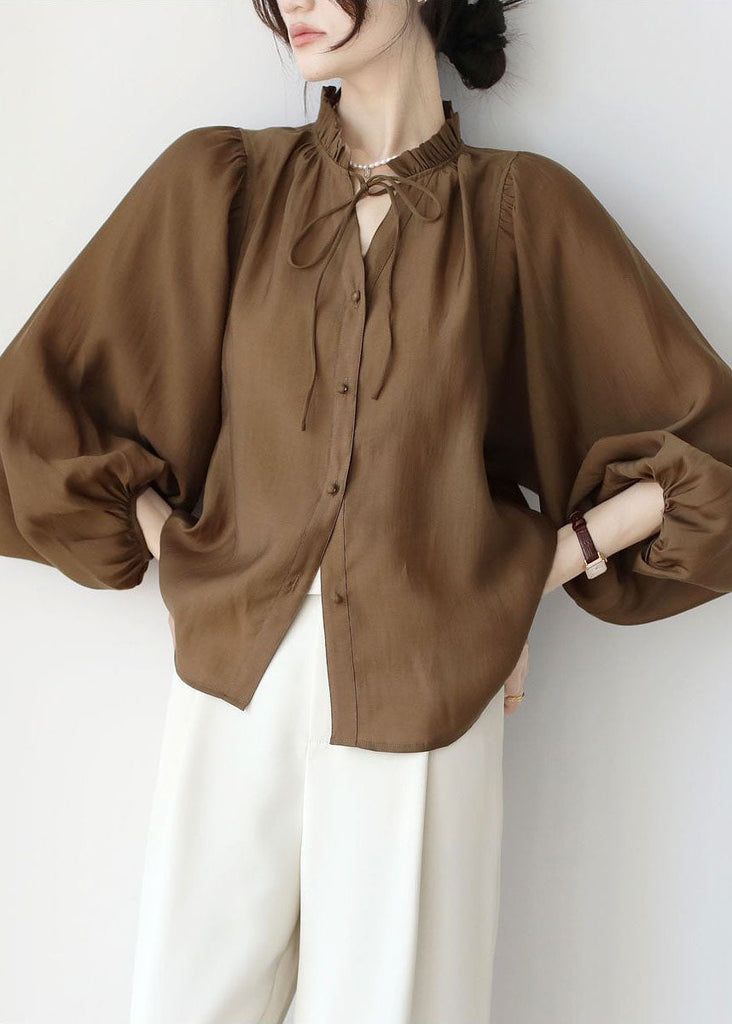 Modern Coffee Ruffled Lace Up Chiffon Shirt Top Lantern Sleeve FR2008
