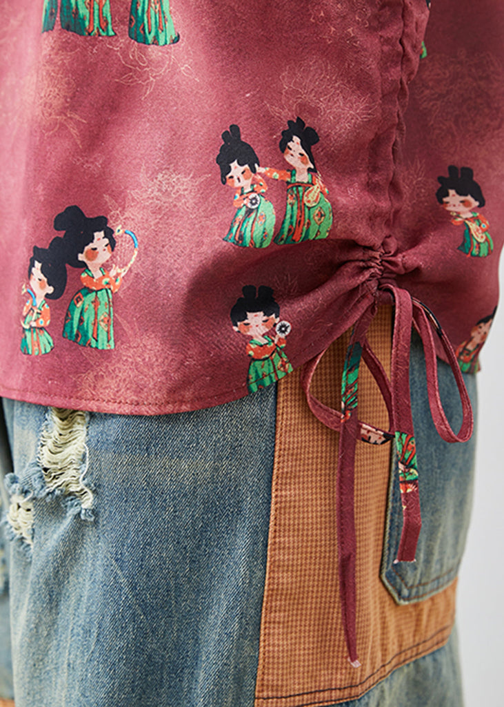Chic Dull Red Print Chinese Button Silk Shirt Summer AP1065