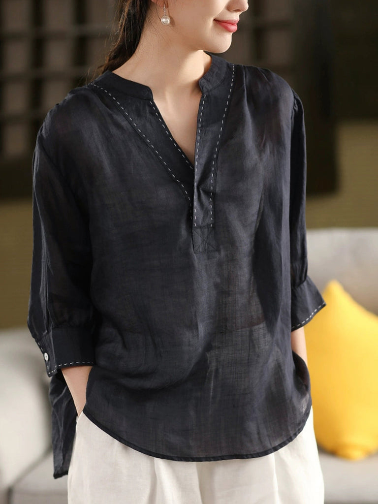 Color 100%Linen Summer V-Neck Pure Shirt Women