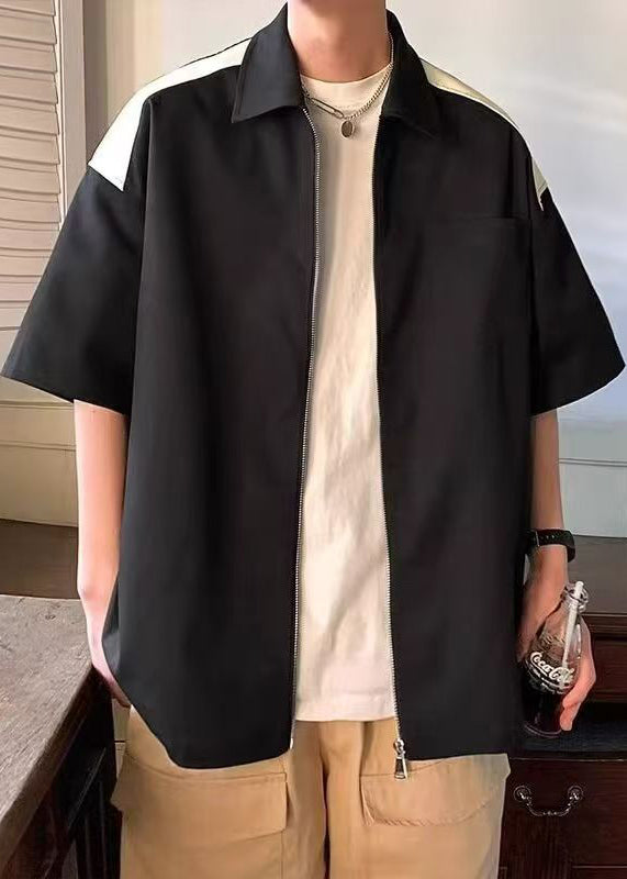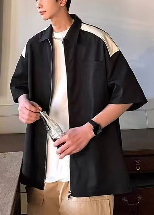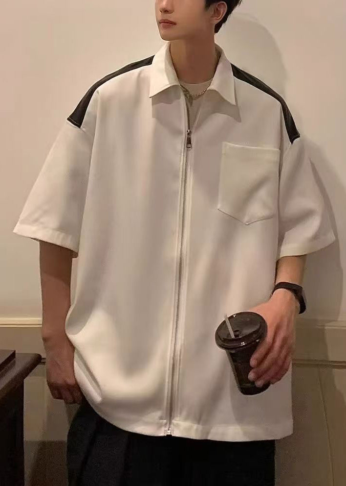 New White Zippered Pockets Patchwork Cotton Mens Shirts Half Sleeve