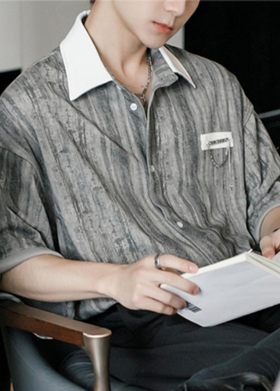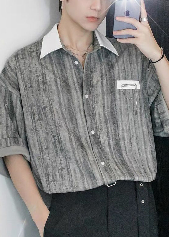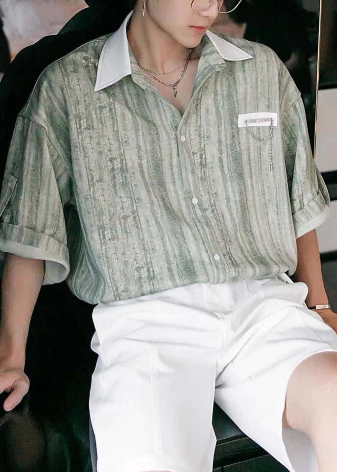 Stylish Light Green Striped Button Patchwork Cotton Men Shirts Half Sleeve