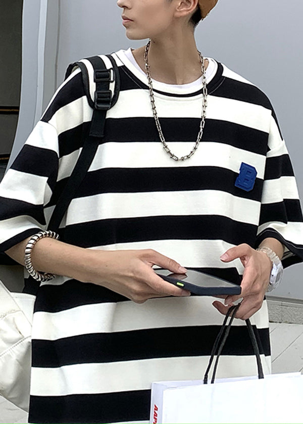 New Blue O Neck Striped Cotton Men's Grunt Style T Shirts Summer QH014