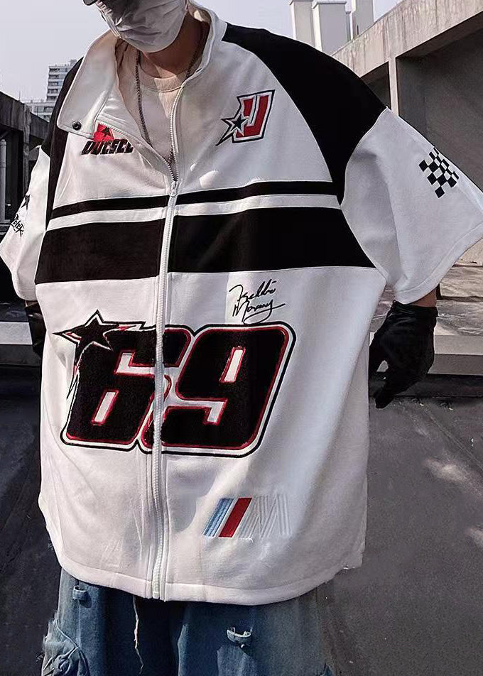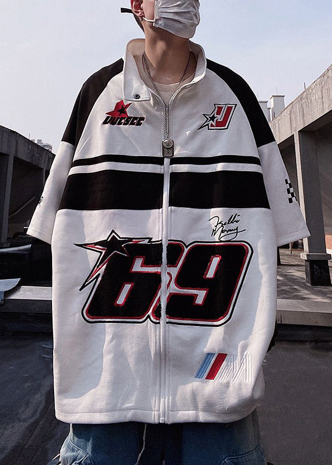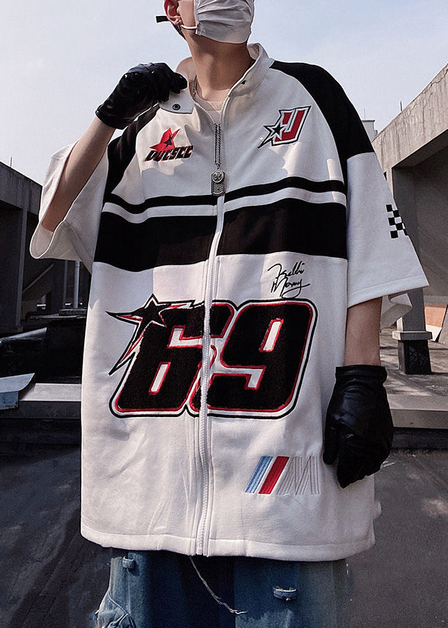 Plus Size White Zip Up Print Cotton Mens T Shirts Half Sleeve