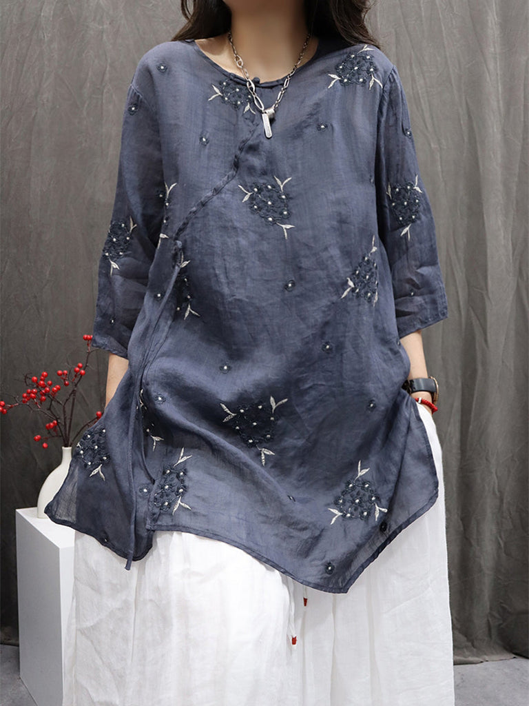 Shirt Embroidery Flower 100%Ramie Summer Women O-Neck