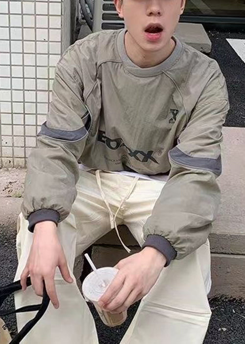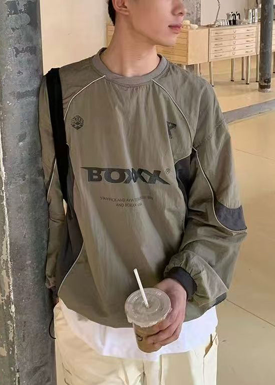 Shirt T Letter Cotton Casual Drawstring Patchwork Green Mens