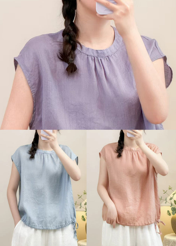 Cozy Pink O Neck Solid Linen Shirt Summer
