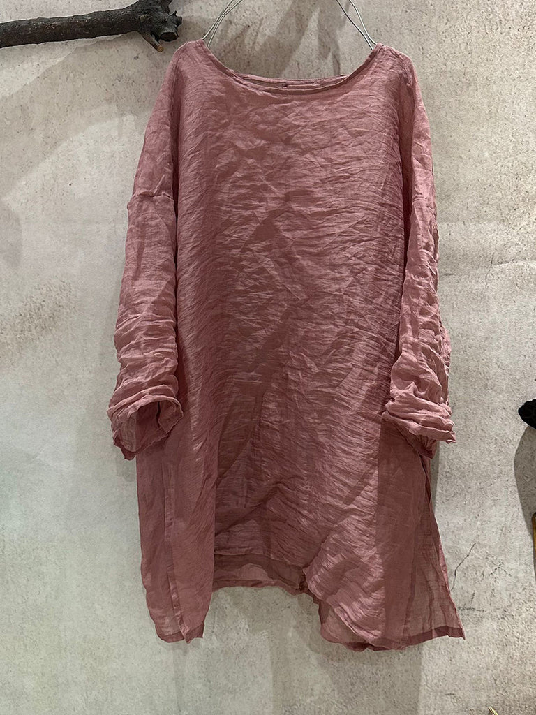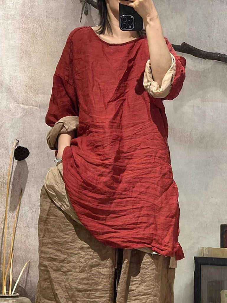 Women Artsy Shirt Ramie Summer O-Neck Pure Color