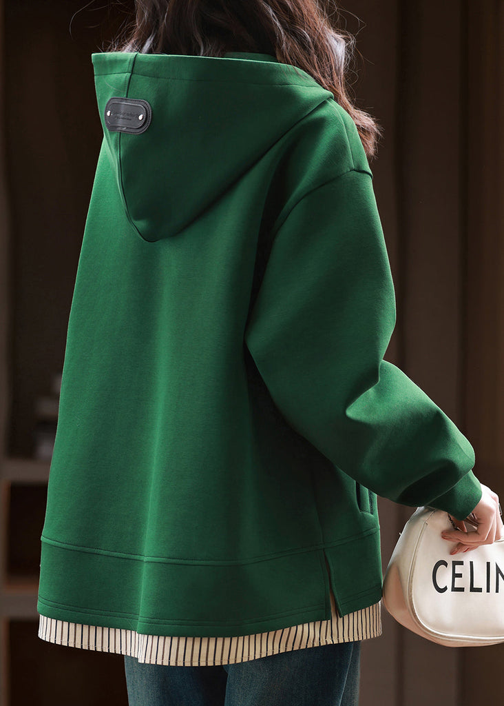 Women Green Zip Up Patchwork Hooded Cotton Pullover Streetwear Fall QI038