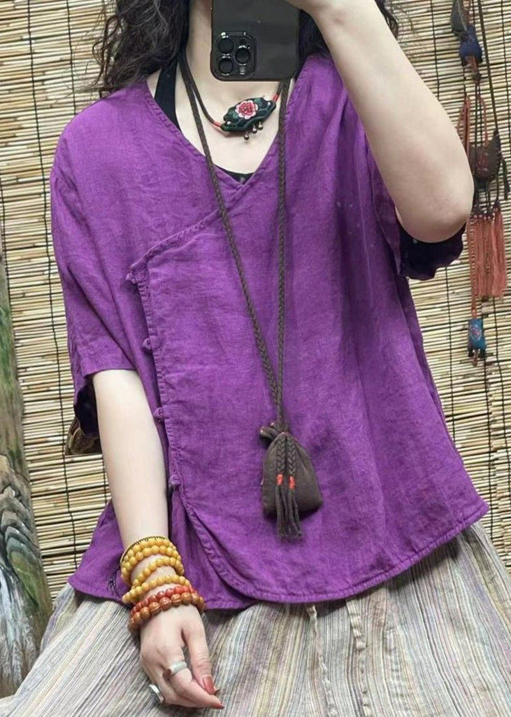 Women Pink V Neck Button Solid Cotton Shirt Summer VV060