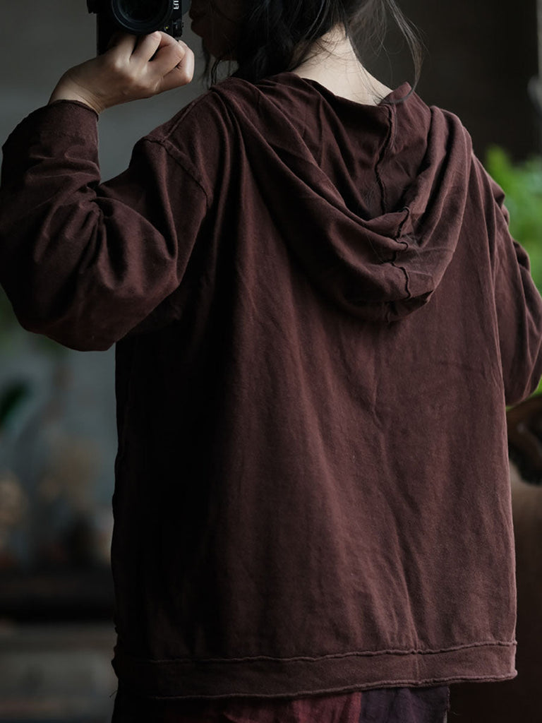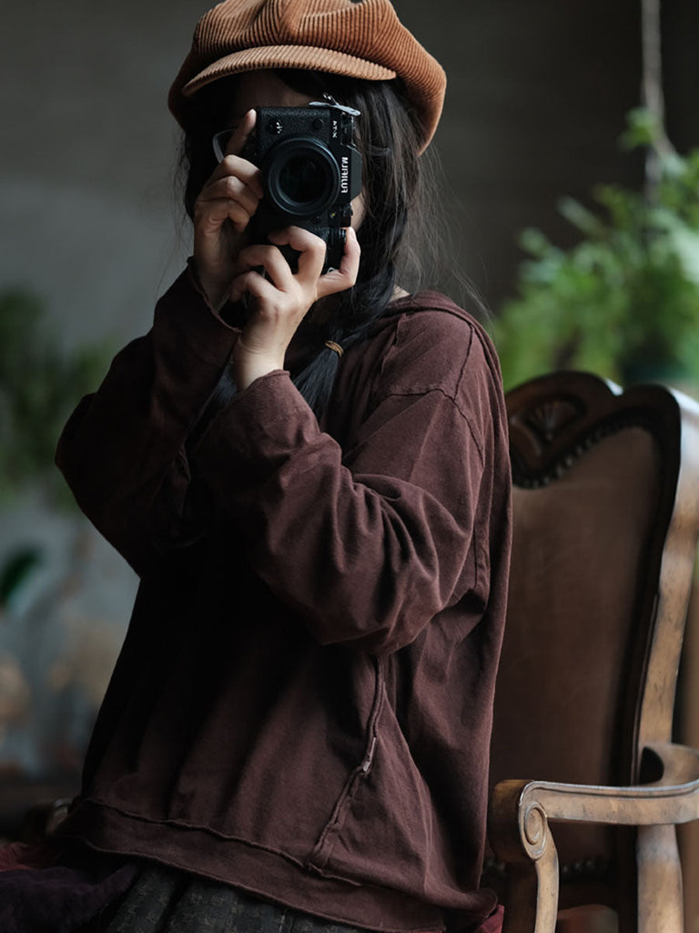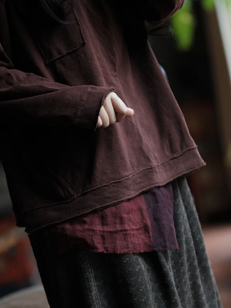Women Retro Spliced Spliced Cottnon Hooded Shirt AV1067