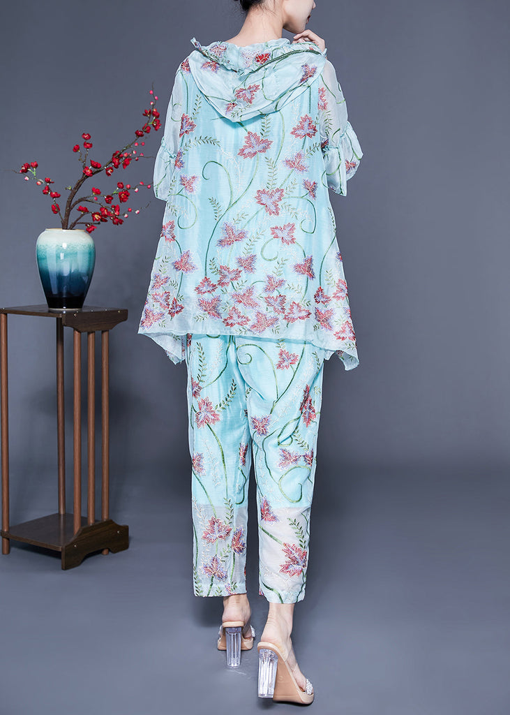 Chic Light Blue Hooded Ruffled Embroideried Silk Two Pieces Set Flare Sleeve