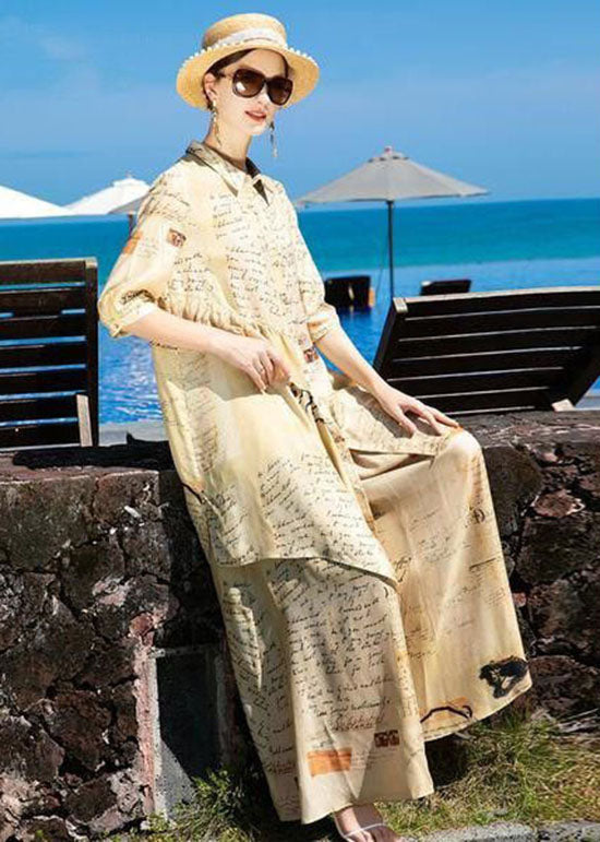 French Apricot Peter Pan Collar Patchwork Print Silk Two Pieces Set Summer
