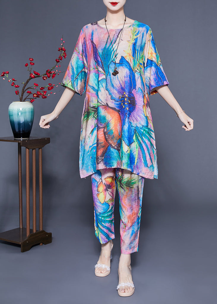 Simple Blue Oversized Tie Dye Side Open Linen Two Pieces Set Summer LY1134