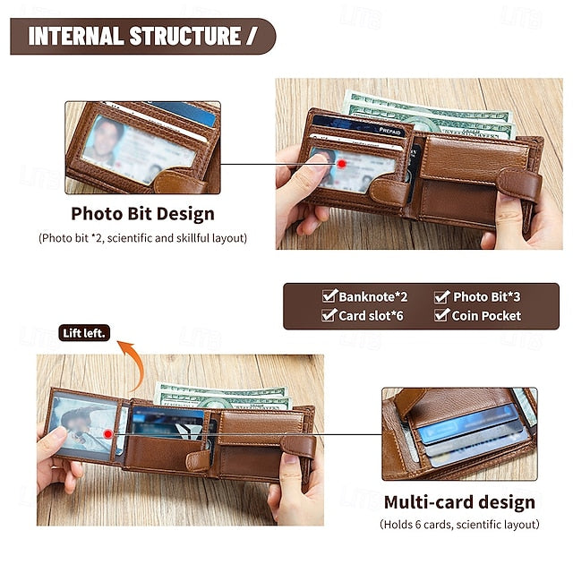 Portefeuille en cuir de vachette véritable, porte-cartes et porte-monnaie multicouches.
