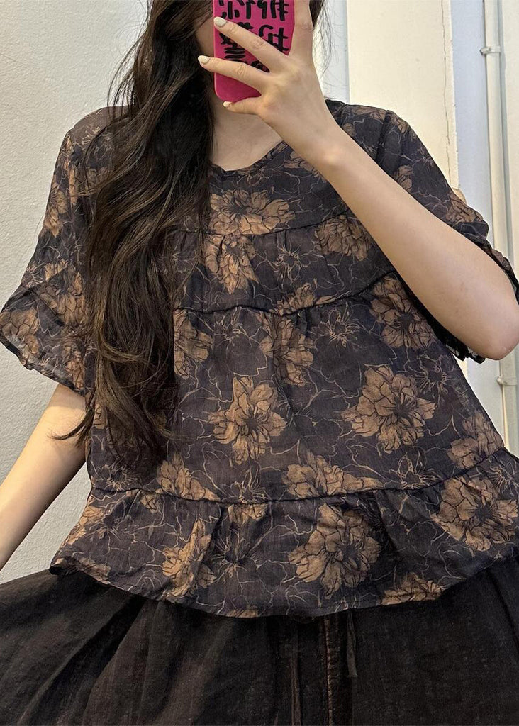 Chemisier ample jaune à col rond en lin patchwork imprimé VV091