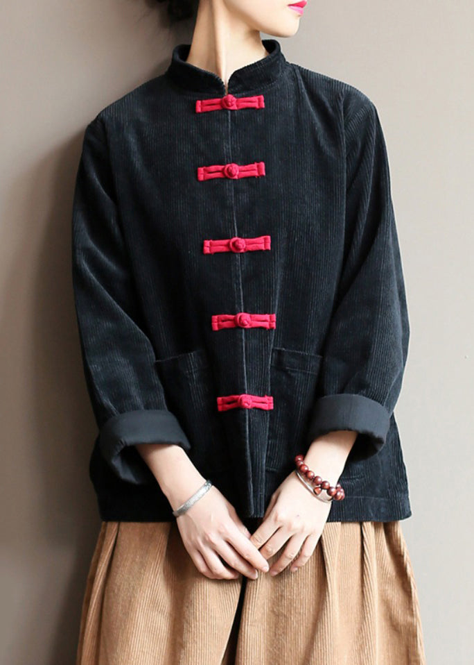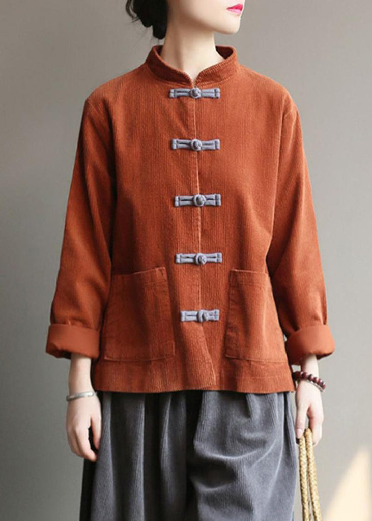 Nouveaux manteaux en velours côtelé caramel à col montant et poches boutonnées, automne QG042