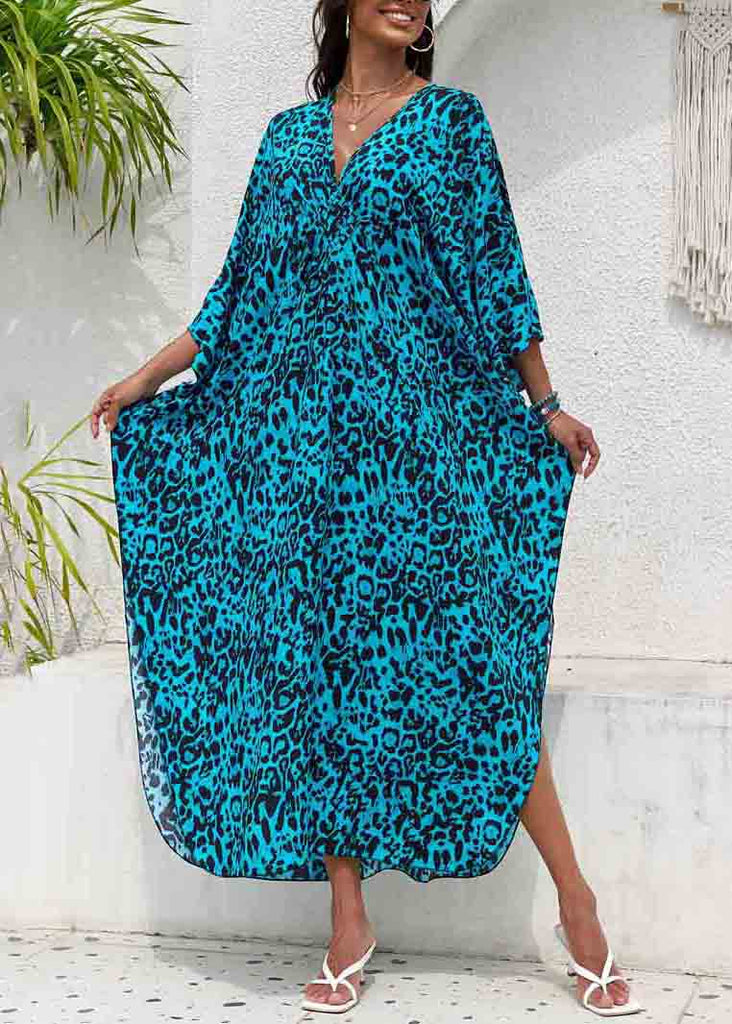 Robe de plage en mousseline imprimée bleu marine, col V, ouverture sur le côté, été